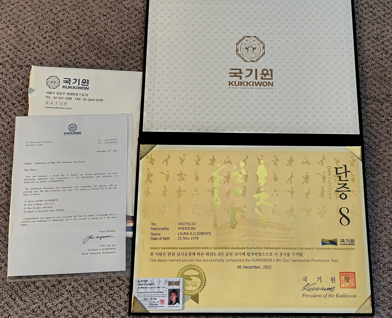 Master Laura received her 8th degree black belt Kukkiwon certificate after testing in Korea in the High Dan testing at the Kukkiwon in November 2025. Thank you to Grandmaster Duk G. Kwon for his support in accompanying Master Laura on the trip. |